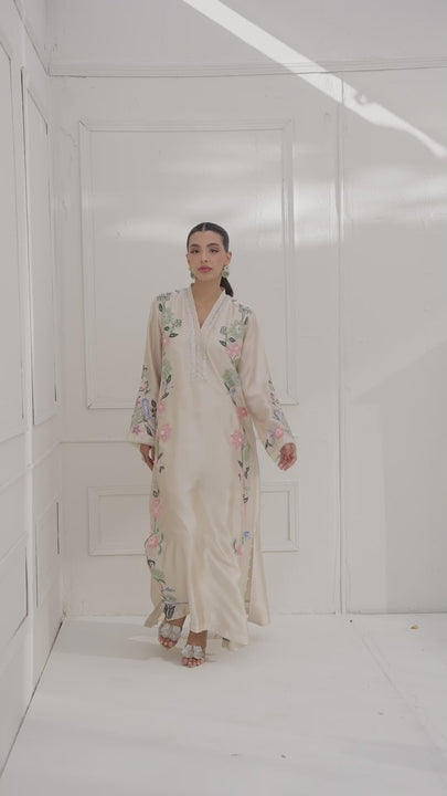 The fawn kaftan embodies subtle elegance, adorned with delicate hand embroidery of pearls, crystals, and sequins, along with soft organza appliqué. Finished with neatly tailored sleeves and paired with straight pants, this ensemble offers effortless comfort with a refined, elevated appeal.