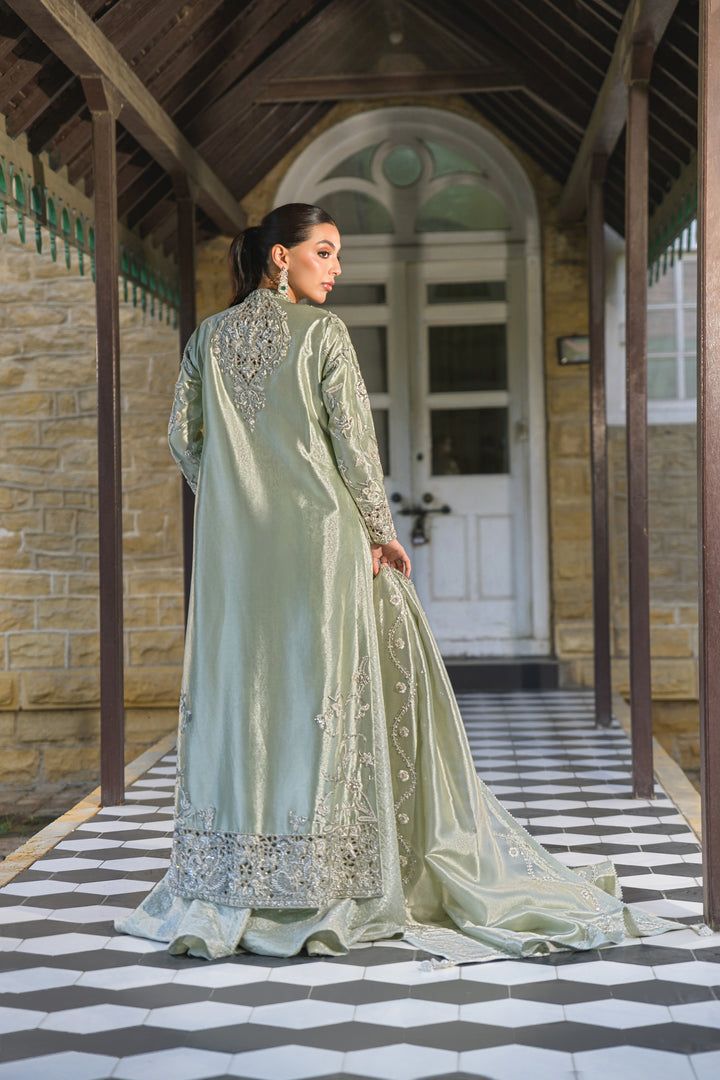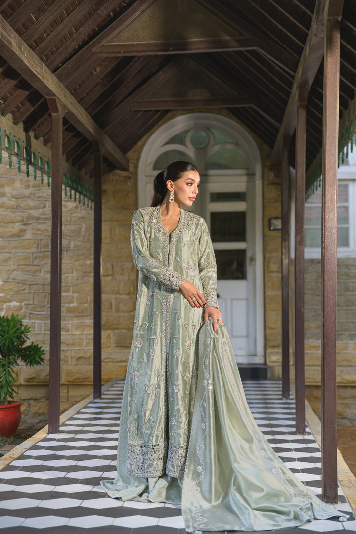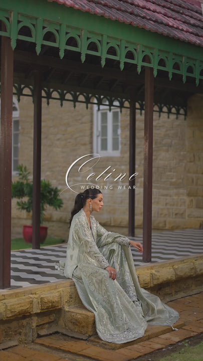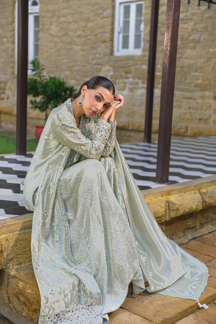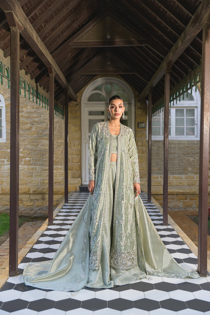 A refreshing mint pure tissue ensemble that embodies subtle luxury and refined craftsmanship. The intricately hand-embellished jacket features resham, pearls, sequins, and zardozi, with delicate cutwork detailing on the neckline and sleeves. It’s paired with brocade dhaka pants and a matching tube top, creating a graceful silhouette. The look is perfected with a beautifully embroidered dupatta, adorned with pearl tassels and intricate border work for a timeless, elegant appeal.