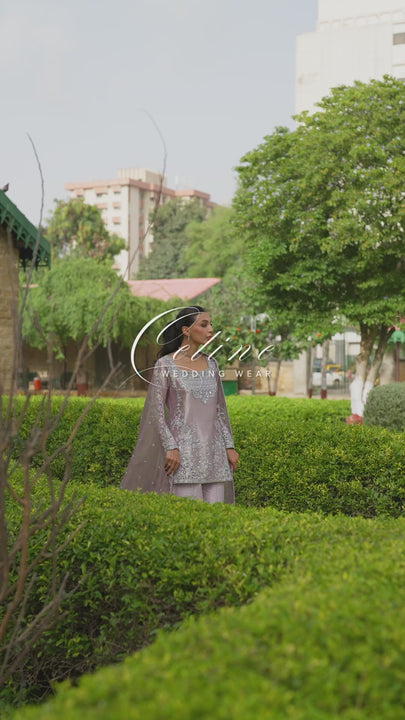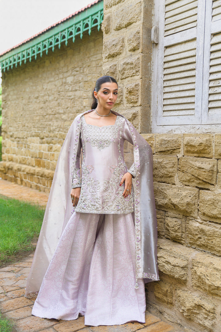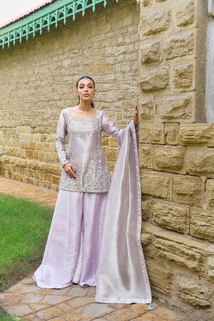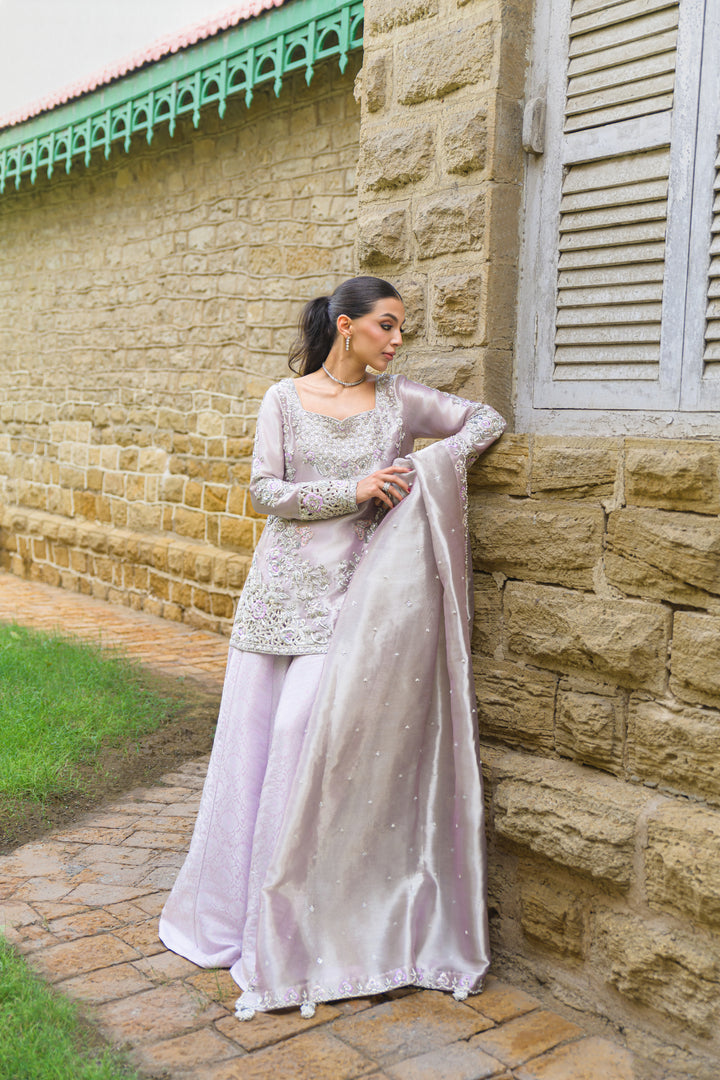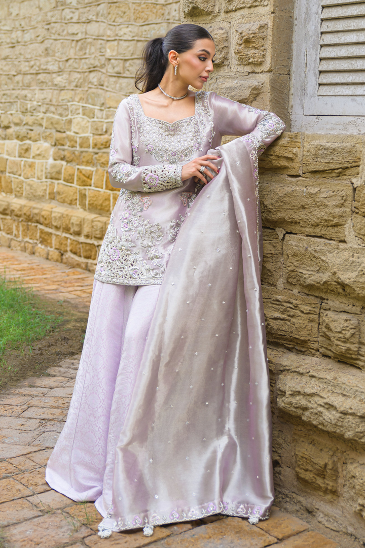 A soft lilac pure tissue ensemble that radiates understated luxury and feminine charm. The shirt is delicately hand-embroidered with resham, zardozi, and sequins, featuring exquisite cutwork detailing on the sleeves and corners. It’s paired with a finely woven brocade lehenga that adds depth and richness, while the pure tissue dupatta, finished with zardozi and pearl embellishments, completes the look with timeless sophistication and grace.
