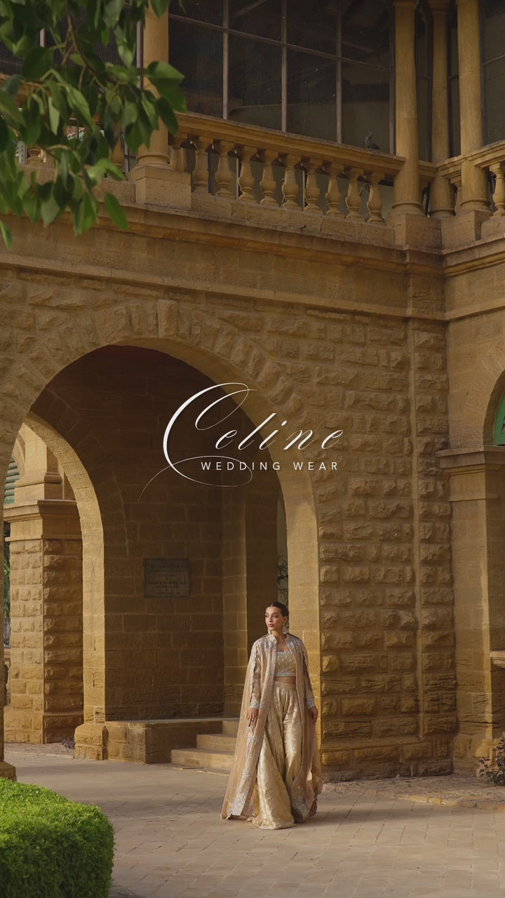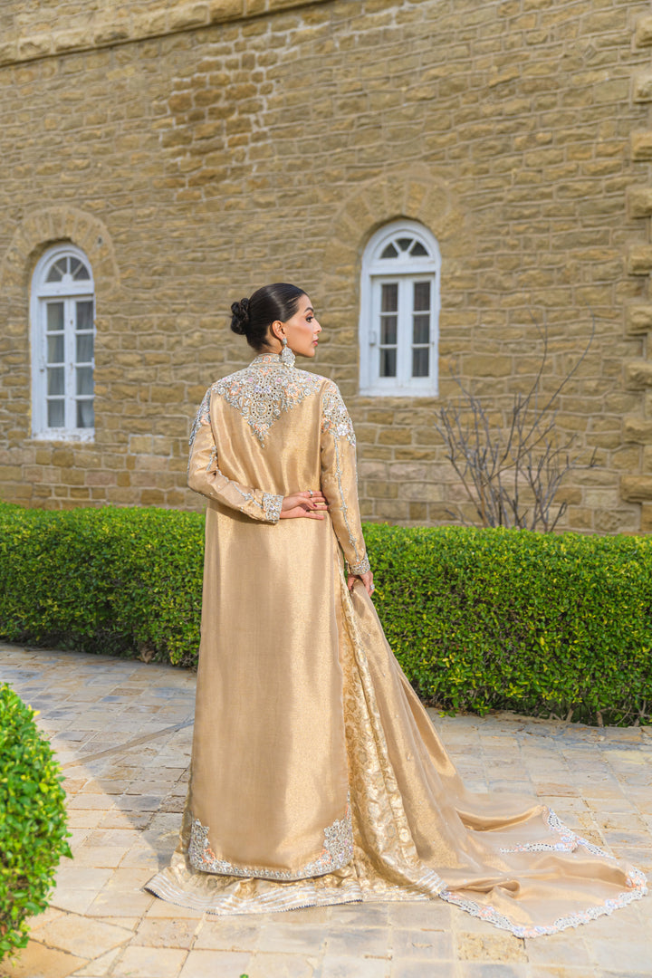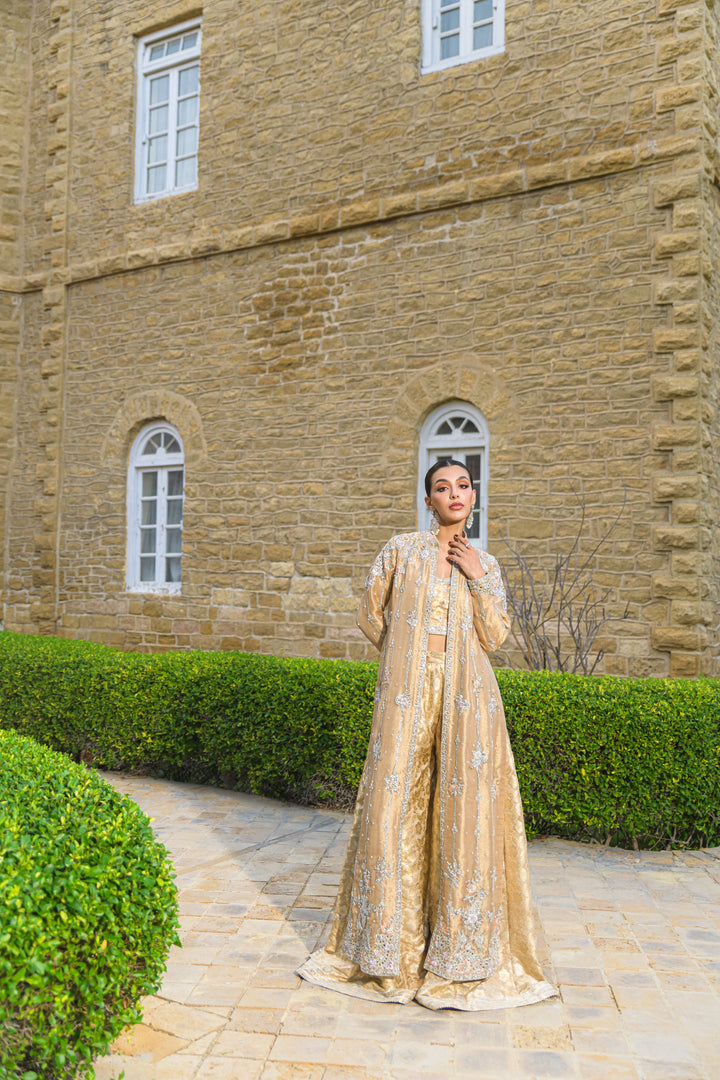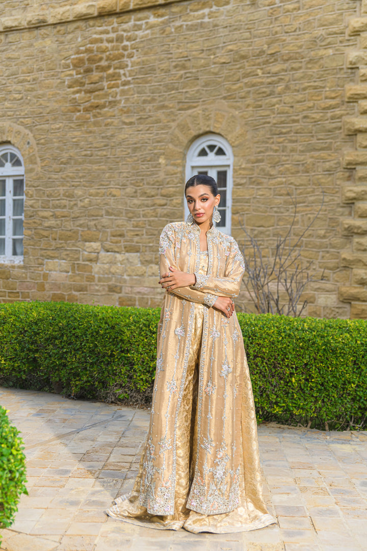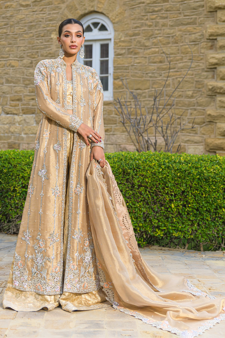 A stunning gold pure tissue net ensemble exuding regal elegance. The front-open jacket is intricately hand-embroidered with resham, zardozi, and sequins, featuring exquisite cutwork on the hem and sleeves. It’s paired with brocade dhaka pants and a matching tube top highlighted with gota and crystal detailing. Completing the look is a scalloped pure tissue net dupatta, delicately adorned with pearls, sequins, and soft spray detailing for a graceful, timeless finish.