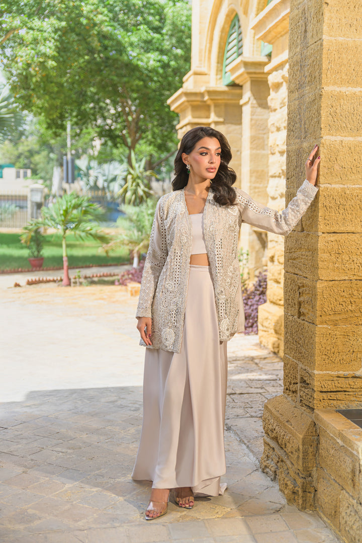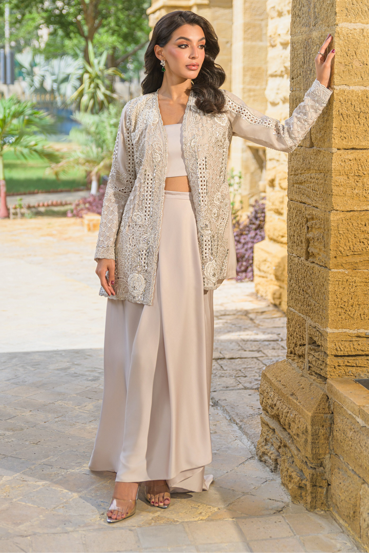 An ivory pure organza ensemble that radiates modern elegance with a touch of classic allure. The front-open jacket is delicately hand-embellished with shimmering crystals, sequins, and pearls, creating a soft, luminous finish. Paired with a sleek silk skirt and a matching tube top, this refined silhouette embodies understated sophistication, making it perfect for contemporary occasions that call for effortless grace and timeless feminine charm.